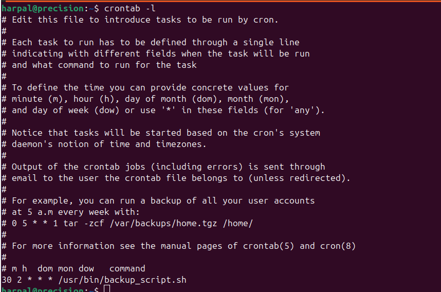 Explanation of the Example 30: Minute (30th minute) 2: Hour (2 AM) *: Day of the month (every day) *: Month (every month) *: Day of the week (any day) The bash script /usr/bin/backup_script.sh is run which takes the necessary backup of the system.